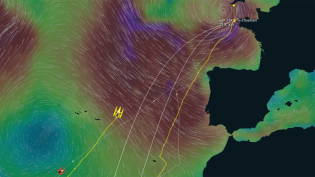 Wind conditions in the North Atlantic for Sodebo (yellow) on Friday 23 January. Red is the Idec Sport benchmark record time. Image: Sodebo team tracker