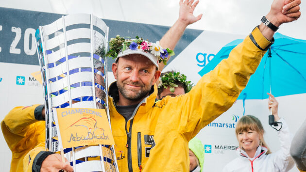 Ian Walker, skipper of the Abu Dhabi Ocean Racing team, celebrates during the winners ceremony in Gothenburg at the end of the Volvo Ocean Race. Photo: Jonathan Nackstrand/AFP via Getty Images
