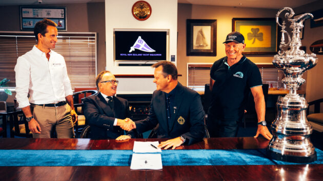 RNZYS Commodore David Blakey and RYS Ltd’s Bertie Bicket shake hands, watched by Sir Ben Ainslie and Grant Dalton, to mark the signing of the Protocol for the 38th America’s Cup, in August 2025. Photo: Suellen Hurling / RNZYS / America’s Cup