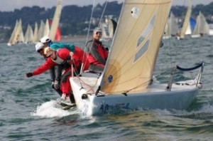 Dave Franzel from the USA takes first race at Sonar Worlds on The Solent