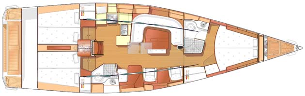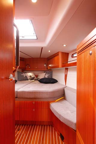 The two aft cabins are roomy and fitted out with a bank of lockers down each side as well as generous hanging space. Racing owners could save quite a bit of weight by going without this additional furniture.