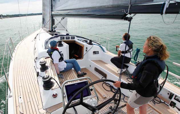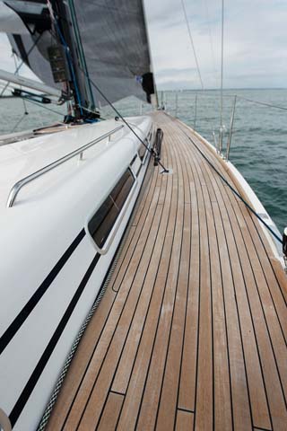 Sleek and uncluttered is the theme running through the 465. The test boat’s German mainsheet, and jib furling line are recessed below wide teak side decks (not standard). The single genoa track sits alongside the coachroof; inhaulers do the work of a second track inboard.