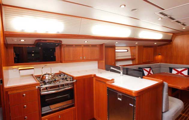 The large galley at the foot of the companionway steps comes with a double top-loading fridge as standard, plus plenty of room for storage and extras. The test boat has a pull-out freezer under the work surface. I was able to work in the galley with the boat heeling but the L-shape at the end of the counter top could be a little larger to get a really firm ‘wedge’ in.