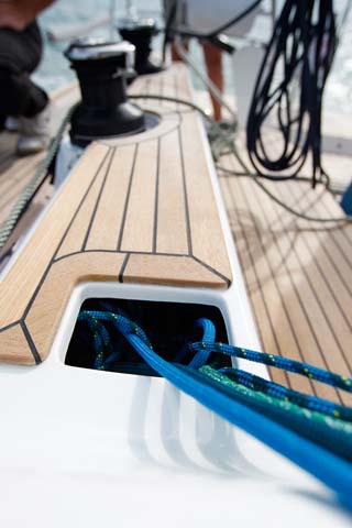 Cavities inside the coaming provide storage for halyards and lazy sheets to keep them off the deck, while the jib car adjustment controls are neatly hidden in recessed pockets in the same area.