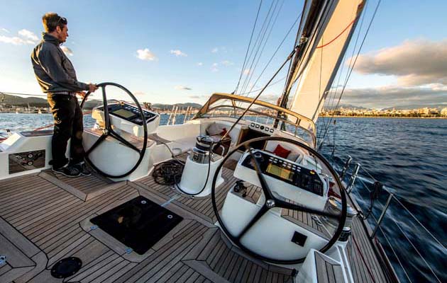 The ability to stand outside the coamings when helming, or sit straddling them, and see along the windward or leeward decks to the telltales and beyond, will rate highly with active sailors. And she’s a yacht you’ll want to stand and helm for long periods – there are no helm seats. Angled foot wells provide the ideal support while standing.