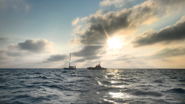 Spanish coastguard vessel approaches at daybreak. Photo: Susan Smillie