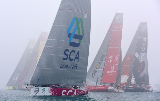 While light winds may have been expected for the start of Leg 3 of the Volvo Ocean Race from Abu Dhabi to Sanya, China, the fog came as a surprise. The reduced visibility made getting around the closed course part of the start even more tricky as teams struggled to see the marks that they were supposed to be rounding.