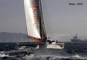 Bruno Peyron's 120ft maxi cat, Orange II, will complete her round the world record attempt in less than 24 hours
