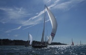 The Meltemi fully established for the day, just two classes sail. Ben, Shirley and her crew deliver the goods
