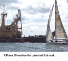 YW's RIB pulls Full Pelt from the Brambles Bank after a keel failure leaves her aground during Cowes Week
