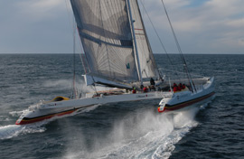 Bruno Peyron's maxi-catamaran crossed the Jules Verne Trophy start line off Ushant this morning