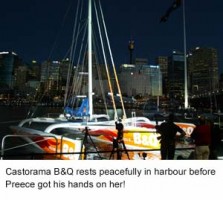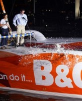 Andrew Preece waits tentatively for a speeding fine as he flies past the Sydney Opera House doing 20kts on Ellen MacArthur's new tri Castorama B&Q
