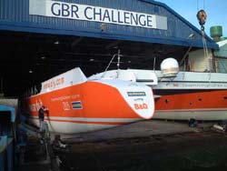 Ellen’s new 110ft catamaran, Kingfisher2 (ex Orange) was successfully launched today sporting her sponsored B&Q and Castorama colours