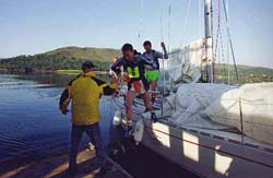 The 110ft maxi-catamaran Maiden II was lowered into the water for the first time under her new name yesterday