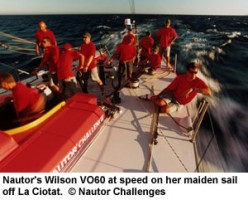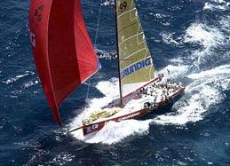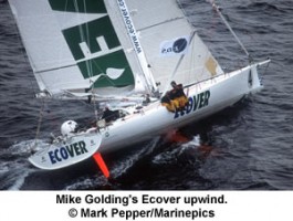 Mike Golding’s Open 60 Ecover is waiting for the sleighride to begin as downwind conditions are forecast to kick in later today