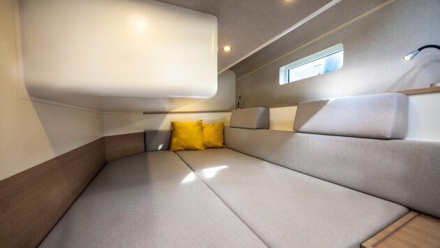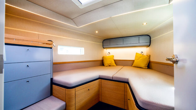 contemporary cosiness: the owners’ cabin forward has a wide berth and plenty of easily accessible stowage space. Photo: Andreas Lindlahr/EYOTY