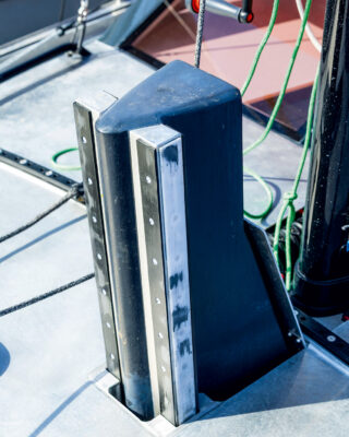 Underneath, the Pure 42 carries a torpedo-shaped lead bulb weighing 3.3 tonnes – a third of the boat’s total displacement. When fully lifted it can, together with the twin rudders, support the yacht’s weight, allowing the crew to beach in shallow waters or to dry-out at low tide without additional supports. Rudder bearings sit in solid aluminium tubes welded into the hull and stiffened inside the watertight aft lockers by four massive knees each.