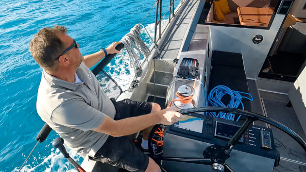 Headsail halyards are tensioned at the mast, on a dedicated winch; sheets and main halyard lead aft to the pedestals, where there are two Andersen winches on either side, one of each electric as standard. This can get a bit busy with the backstays, but it’s a simple and easy layout with good ergonomics, leaving the deep and comfortable crew cockpit uncluttered.
