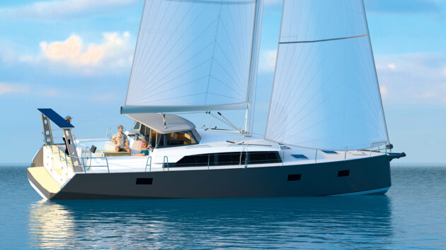 So far five boats have been ordered and the first is scheduled to be afloat ahead of the La Rochelle boat show in September. This example will be fitted with a BellMarine electric propulsion system consisting of twin 20kW EVO shaft-drive motors, a 50kW lithium battery bank, more than 1,600W of solar panels, plus a 22kW generator.