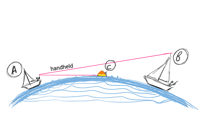 If you are in a liferaft, sitting on the surface of the sea calling out a mayday, then your signal won’t go very far. We can see that if boats A and B are roughly 10 miles apart, They can both communicate with a liferaft between them, but for boat A to C, that communication will be at it’s limit at just 4 or 5 miles.